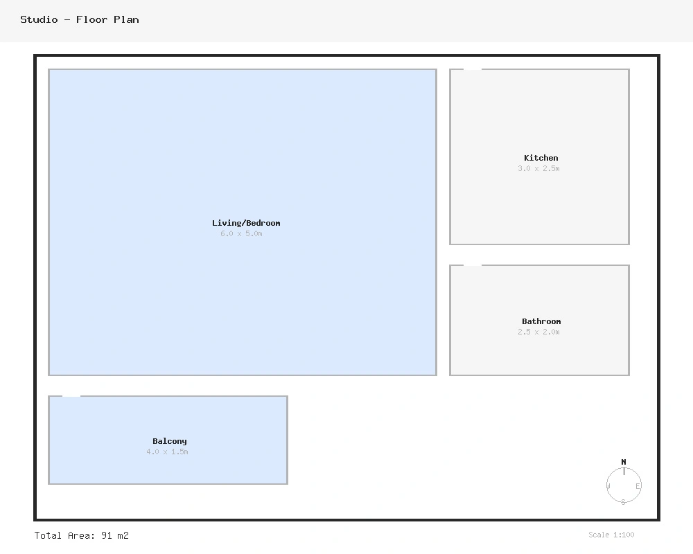 Modern studio apartment perfect for young professionals. Open-plan living with fully equipped kitchen.